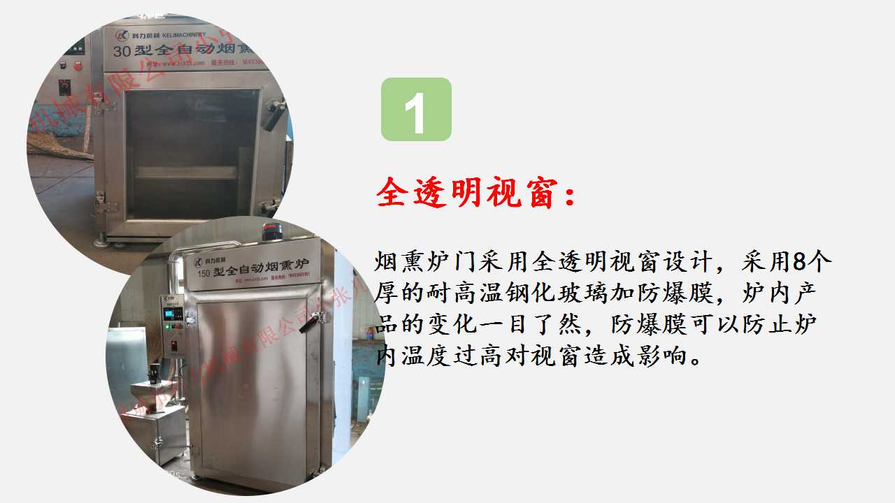 爐體是進(jìn)行煙熏上色蒸煮烘干的場(chǎng)所,上部有葉輪,葉輪的作用是在軸流電機(jī)的帶動(dòng)下將吸上來(lái)的熱氣、煙霧進(jìn)行擴(kuò)散,達(dá)到均勻地效果。電加熱管在兩側(cè),升溫速度快,受熱均勻。一個(gè)溫度探頭,用于測(cè)爐內(nèi)溫度外觀的幫助我們判斷產(chǎn)品的熟化狀態(tài)。爐內(nèi)兩側(cè)有獨(dú)立煙道,上部設(shè)有排氣口、排煙口,側(cè)面專門有蒸汽對(duì)流口,目的也是保證爐內(nèi)溫度、煙霧上下一致的效果,避免上下溫度不一致,煙熏色澤不一致的狀況。在爐內(nèi)的底部設(shè)有排水口,排除蒸汽遇冷凝結(jié)形成的水珠。爐體采用8個(gè)厚的鋼化玻璃貼有特制防爆膜制作大玻璃窗(150型以上采用實(shí)體不銹鋼門),可清晰觀察爐內(nèi)產(chǎn)品的加工過(guò)程及及時(shí)排除突發(fā)狀況,安全可靠。