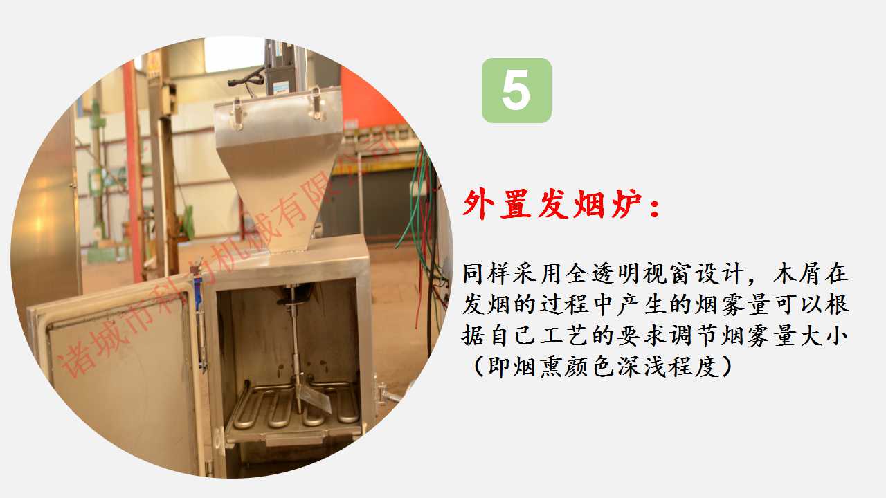 采用外置式木粒、木屑發(fā)煙系統(tǒng)。優(yōu)異的發(fā)煙及循環(huán)系統(tǒng),可使?fàn)t內(nèi)的煙霧均勻分布,從而使肉制品上色均勻,色澤美觀,保證產(chǎn)品具有較高的出品率。 加熱方式采用電加熱方式。